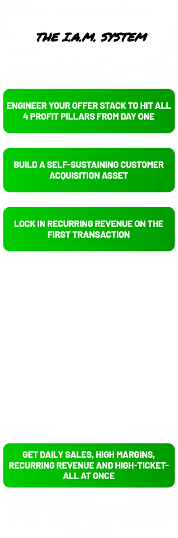 The I.A.M. System flips this on its head by engineering your entire customer acquisition machine to hit every profit pillar from day one on the VERY FIRST Transaction.